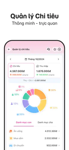 Ứng dụng được thiết kế đơn giản, trực quan, phù hợp với mọi đối tượng. Người dùng có thể dễ dàng quản lý các khoản thu chi và truy cập nhanh vào các tính năng chính.